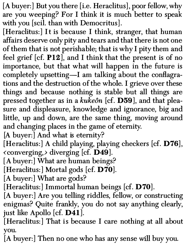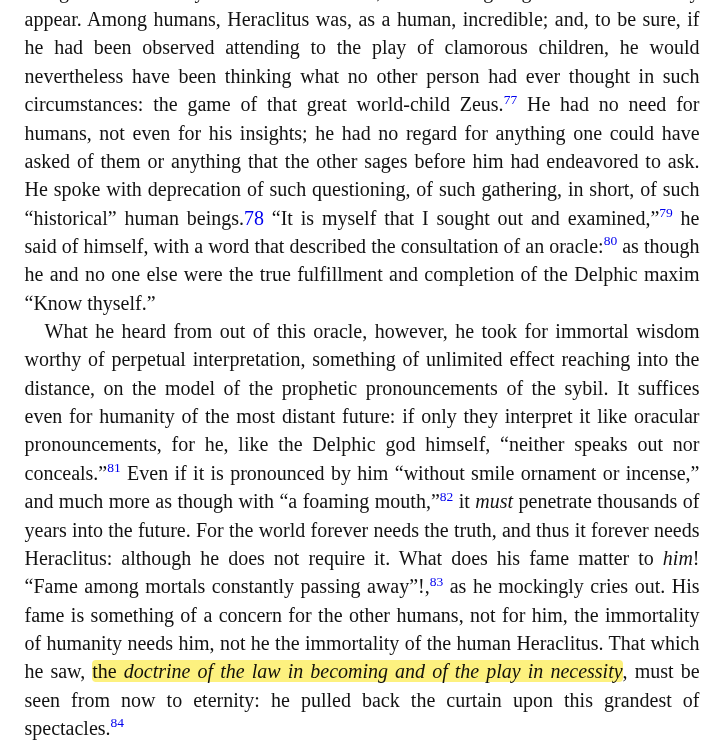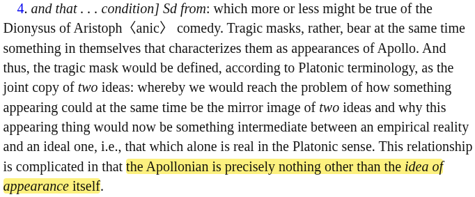 "eine Art Übermensch ist" —: e.g. "Heraclit ["Cosmodicee der Kunst."]. Künstlerische Weltbetrachtung. / Anaxagoras. Naturgeschichte des Himmels. Teleologie. Athenischer Philosoph. / Empedocles [Plato: "Ägyptische Taubheit und Kälte"]. Der ideal-vollkommene Grieche." usw. [wrt to "higher kind"/"ein höherer Typus"]: Und ihrem Einfluss ist es zuzuschreiben, dass die durch Jahrhunderte fortlebende Anschauung des griechischen Alterthums mit fast unüberwindlicher Zähigkeit jene blassrothe Heiterkeitsfarbe festhielt — als ob es nie ein sechstes Jahrhundert mit seiner Geburt der Tragoedie, seinen Mysterien, seinen Empedocles und Heraclit gegeben habe, ja als ob die Kunstwerke der grossen Zeit gar nicht vorhanden seien, die doch — jedes für sich — aus dem Boden einer solchen greisenhaften und sklavenmässigen Daseinslust und Heiterkeit gar nicht zu erklären sind und auf eine völlig andere Weltbetrachtung als ihren Existenzgrund hinweisen. Die Macht selbst im Menschen erhöht, und nicht die Philosophie (oder die Philosophen) an sich.