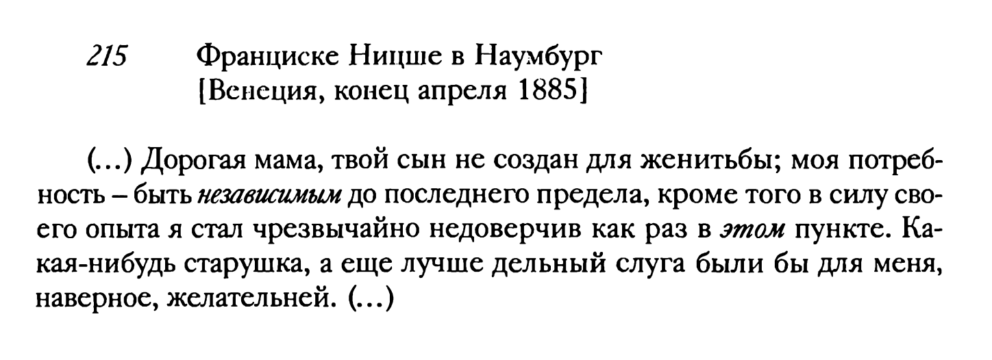 1883 427. An Carl von Gersdorff in Ostrieben Что касается меня, то я прошел через долгий и тяжелый период духовного аскетизма, который я добровольно взял на себя и на который не каждый бы осмелился. Последние шесть лет были в этом смысле годами моего величайшего самопреодоления: при этом я еще не учитываю то, что помогло мне преодолеть проблемы со здоровьем, одиночество, непонимание и осуждение.