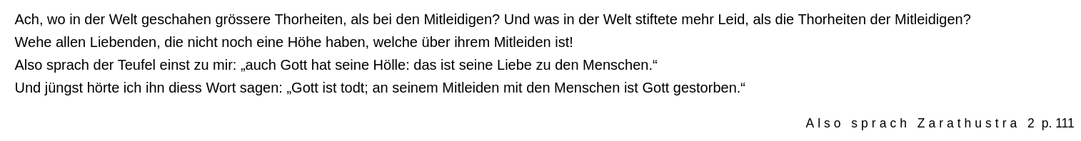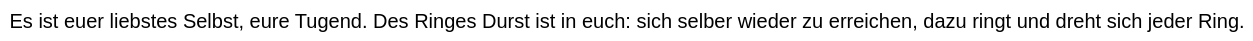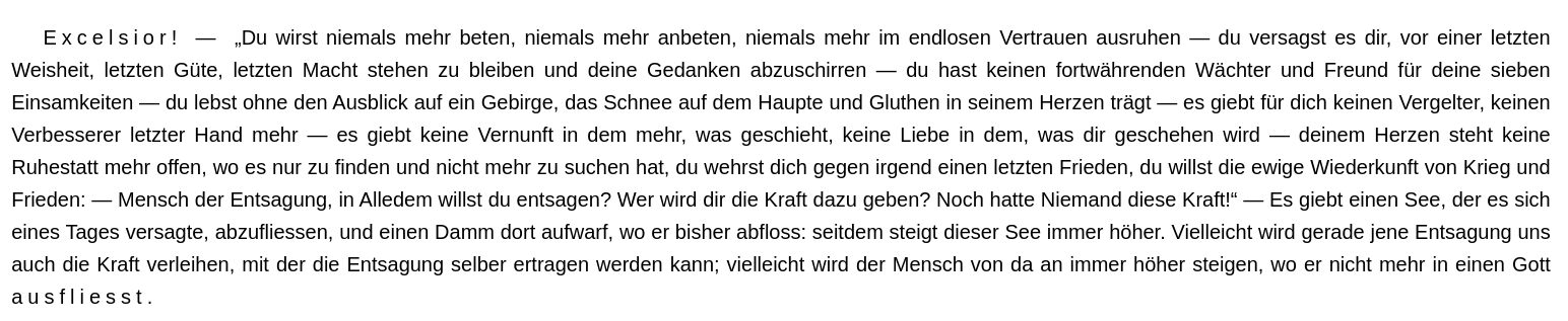 Wenn ich je stille Himmel über mir ausspannte und mit eignen Flügeln in eigne Himmel flog: Wenn ich spielend in tiefen Licht-Fernen schwamm, und meiner Freiheit Vogel-Weisheit kam: — — so aber spricht Vogel-Weisheit: „Siehe, es giebt kein Oben, kein Unten! Wirf dich umher, hinaus, zurück, du Leichter! Singe! sprich nicht mehr! — „sind alle Worte nicht für die Schweren gemacht? Lügen dem Leichten nicht alle Worte! Singe! sprich nicht mehr!“ — Oh wie sollte ich nicht nach der Ewigkeit brünstig sein und nach dem hochzeitlichen Ring der Ringe, — dem Ring der Wiederkunft? Nie noch fand ich das Weib, von dem ich Kinder mochte, es sei denn dieses Weib, das ich liebe: denn ich liebe dich, oh Ewigkeit! Denn ich liebe dich, oh Ewigkeit! — Lust will aller Dinge Ewigkeit, will tiefe, tiefe Ewigkeit!