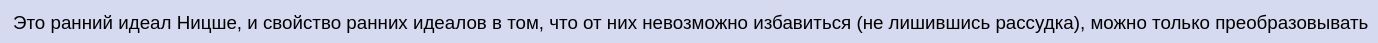 Отдельная тема Рождение трагедии. Там Ницше романтик (скорбит о мифе) и метафизик (пишет о "сущности мира" и "проявлении"), он от этого потом отказывается и критикует 18 лет.