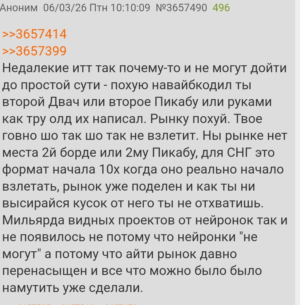 Может поэтому IT-пространства полны токсиков: если ты не идейный гик, страстно любящий кодить, тяжело осознавать, что ты годами тратишь ресурс мозга на "знания", которые будут однажды выкинуты на помойку, потому что всегда были лишь абстракциями, придуманными задротами для задротов. Поэтому самоутверждаться этими "знаниями" ты можешь только в их среде, и нигде больше. Как и уровнем зарплаты - у окружающих на слуху всегда кабаны, которые делают в разы больше. Ну и специфические выебоны от тех, кто успешно свалил за кордон - но действующие только на оставшихся в СНГ, потому что по меркам запада ты получаешь среднюю офисную з/п, и там нет снгшного пиетета перед ИТшными зарплатами.
