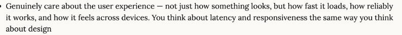 >>3665514 Там же сказано, что должен разбираться в мельчайших нюансах загрузки и работы кода фронтенда на всех устройствах. Т.е., например, вышла какая-то новая версия крайне популярно планшета или браузера или андроида, надо срочно максимально оптимизировать всё под него, но про него ещё мало что известно, т.к. он только вышел и нейронке не на чем обучаться.