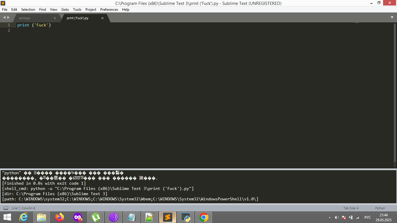 Подскажите, кто знает, не знаю, куда написать, нужен быстрый ответ. Через месяц сдавать экзамены, нужно научиться решать задание по информатике, установил Sublime Text, а тут такая хуйня пикрелейтед, когда пытаюсь на питоне писать. Короче, куча иероглифов вместо результата. Пользуюсь Виндовс 8.1. Как исправить?