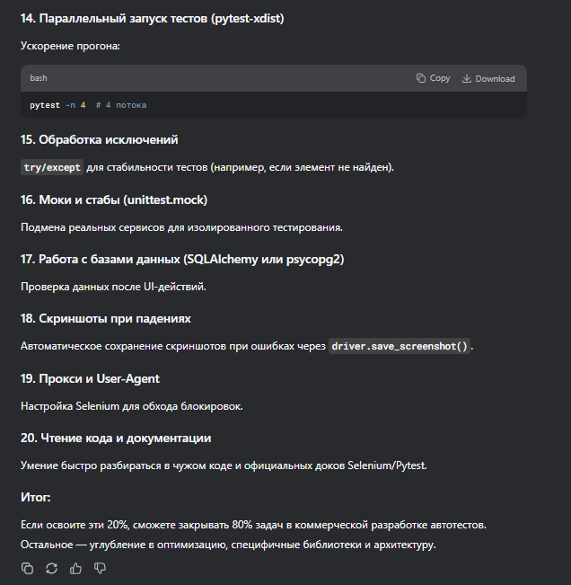 >>3468305 Изучи базовый синтаксис ООП Всякие обработки ошибок в блоках try/except Логирование Паттерны проектирования автотестов Принципы программирования