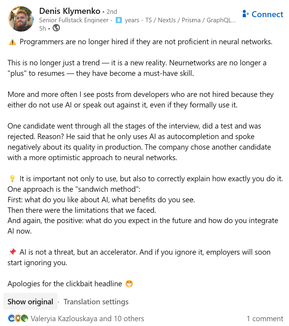 Скоро мы будем (хотите вы того или нет) - prompt engineer'aми. И это не плохо - я уже сейчас хочу просто написать и описать ему проблему - а он напишет все за меня, попутно разжевывая и кладя в ротик.
