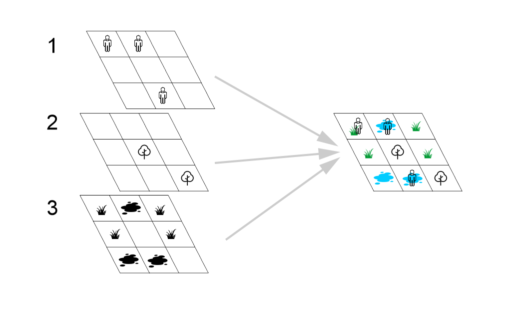 Вариант 2. Использовать полноценный ООП. У тебя массив агентов, а координаты агентов хранятся в самих агентах. Плюсы: - полноценный ООП, лол - менее ресурсоемко с точки зрения памяти т.к. в списке хранятся только существующие объекты, потому что в первом варианте у тебя ячейка будет существовать даже если там никого нет Минусы: - чтобы определить соседние объекты, придется перебирать весь список. С другой стороны это решается теми же слоями.