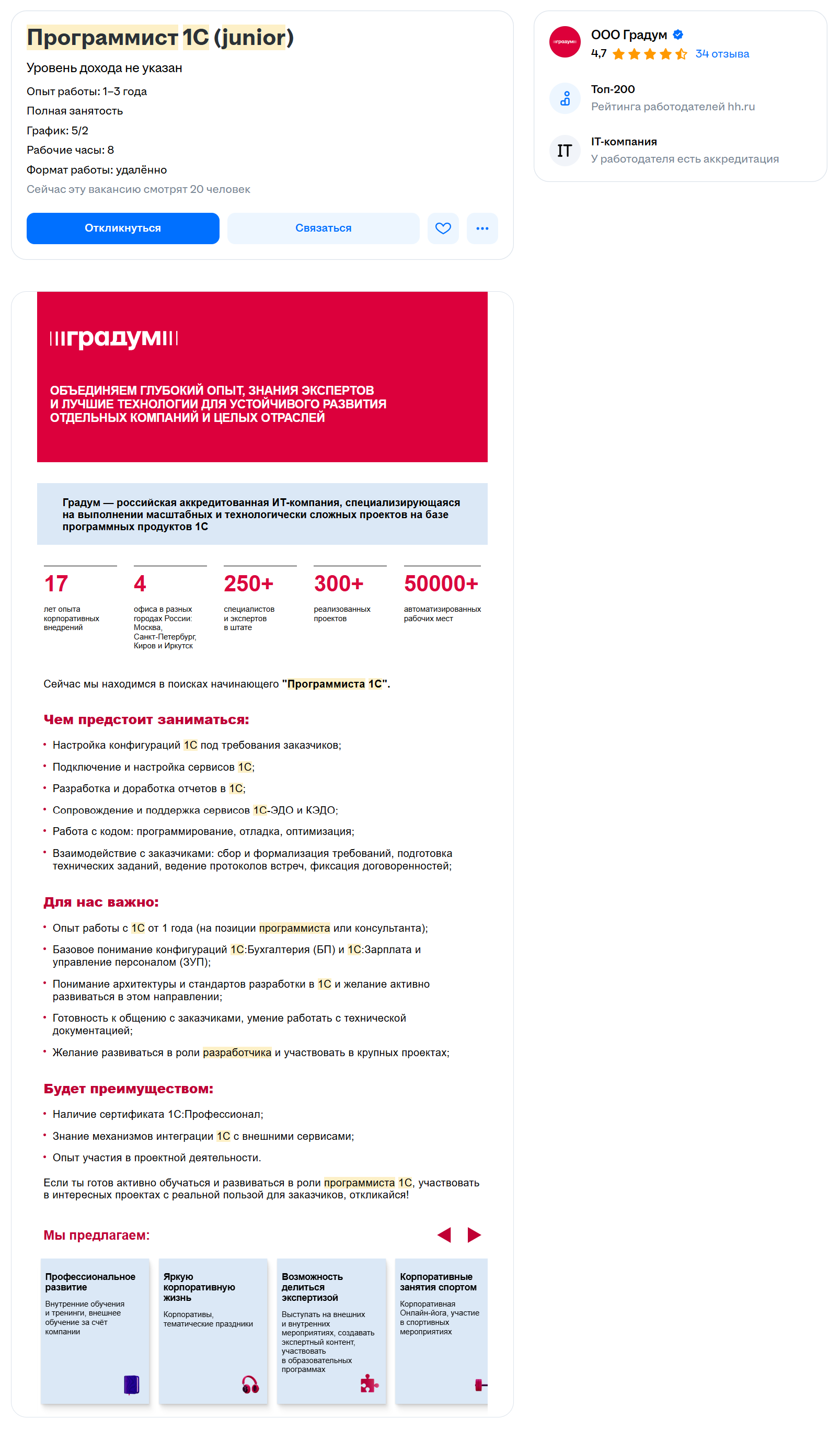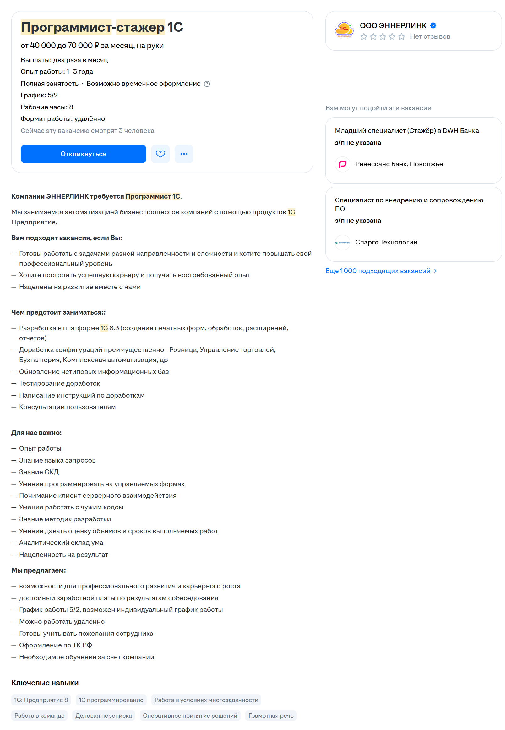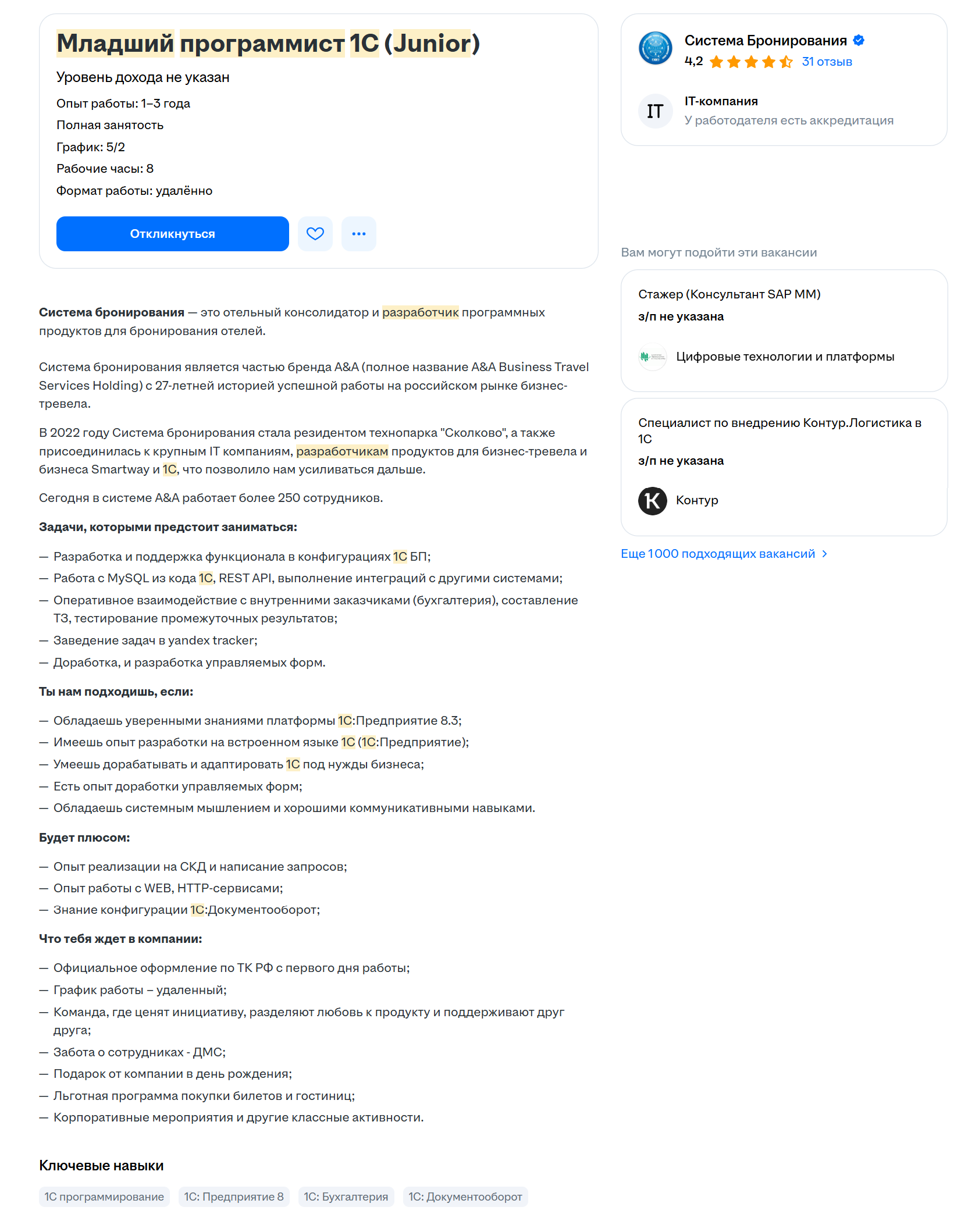 Что скажете? Грамотный анализ рынка? Мне кажется, я создан быть аналитиком. А ведь потом получив запись в трудовой "Аналитик", я смог в будующем легко трактовать это как: Data Analyst, продуктовый аналитик, бизнес-аналитик, системный аналитик. То есть перекат из 1С в другую область легчайший, надо лишь получить харды каким-то образом, а запись в трудовой уже будет.