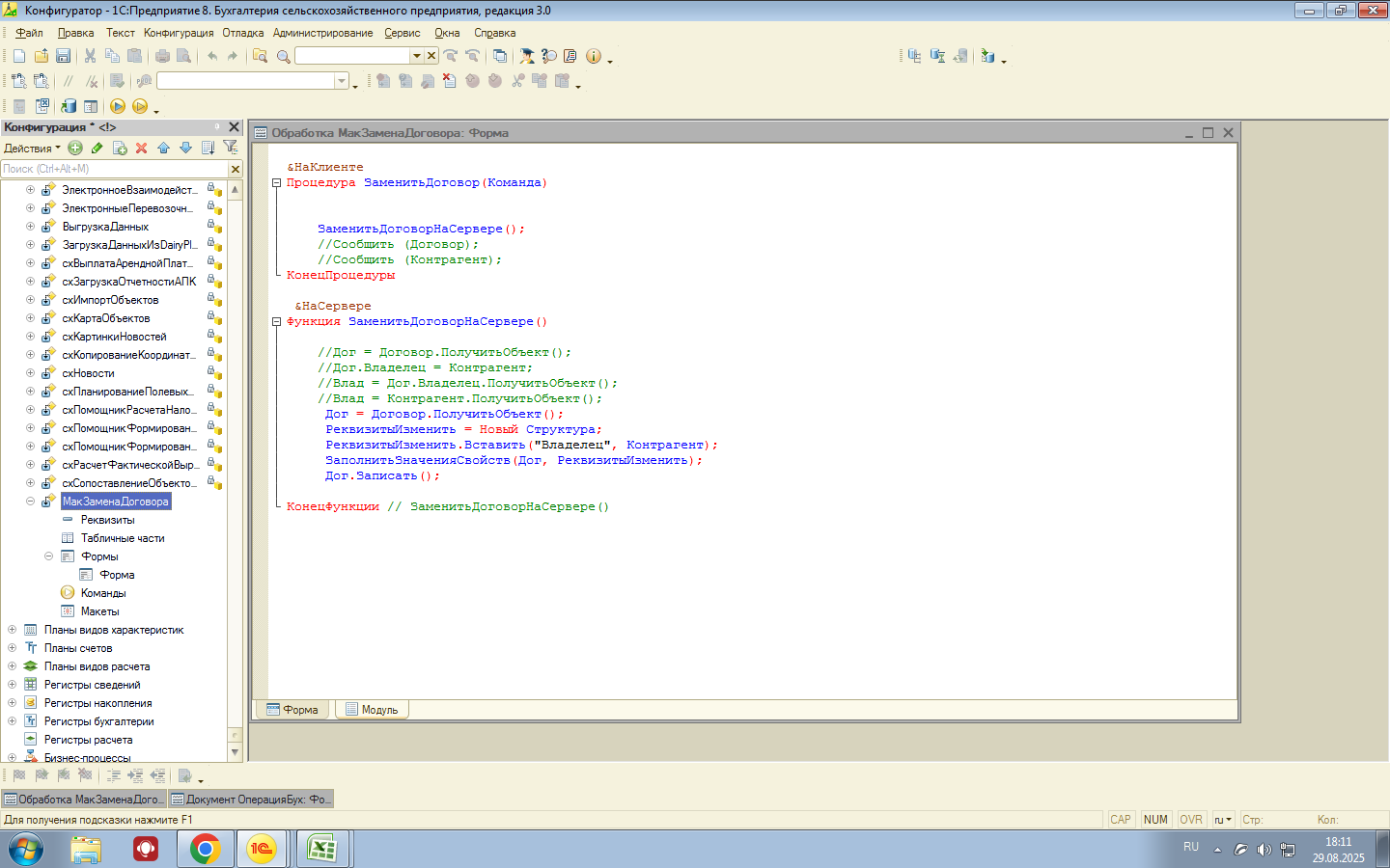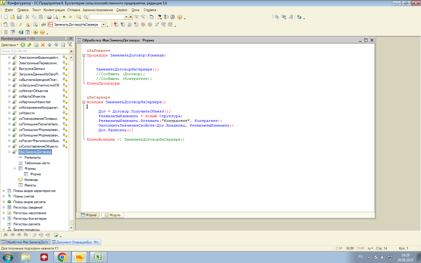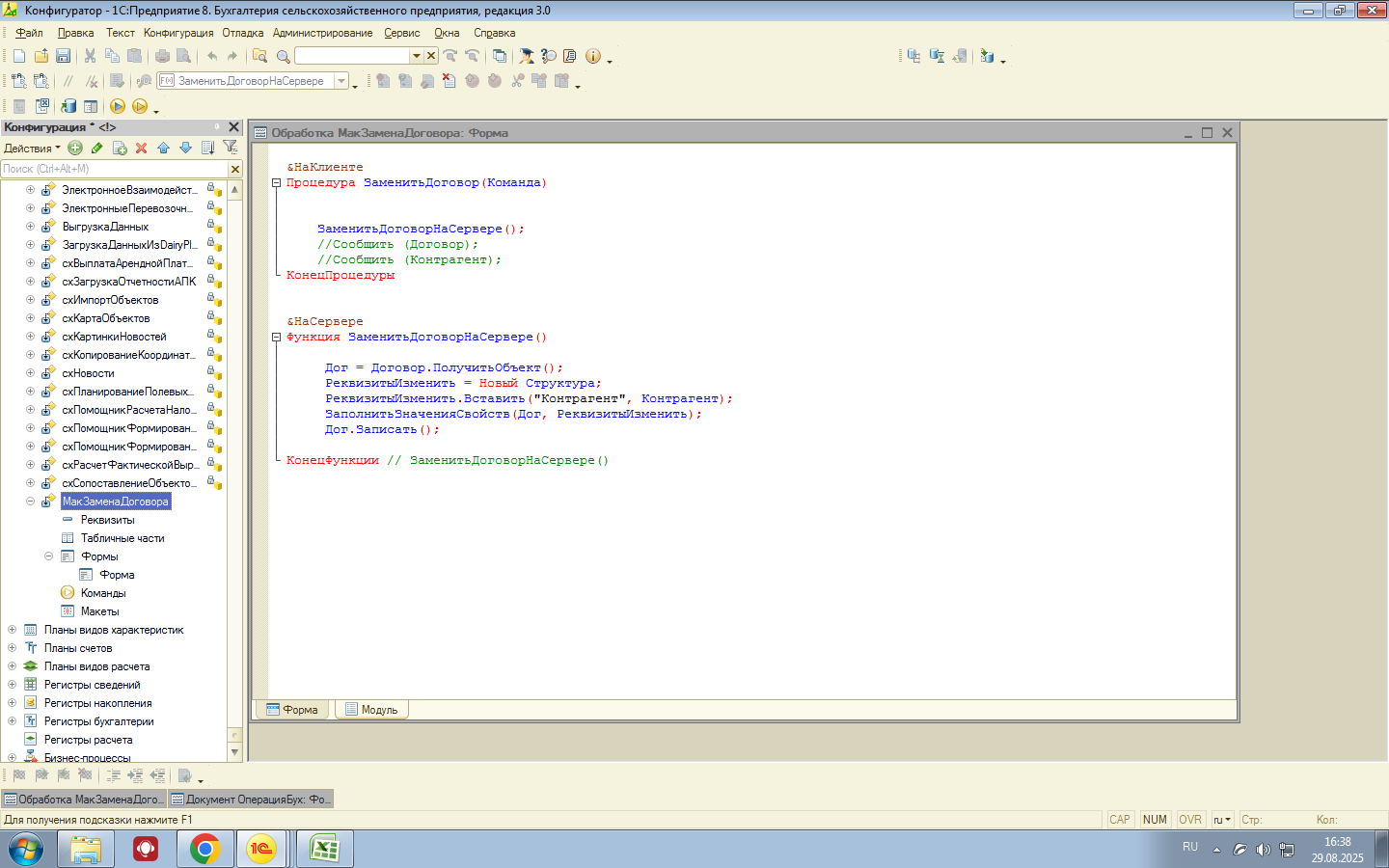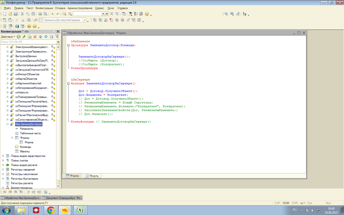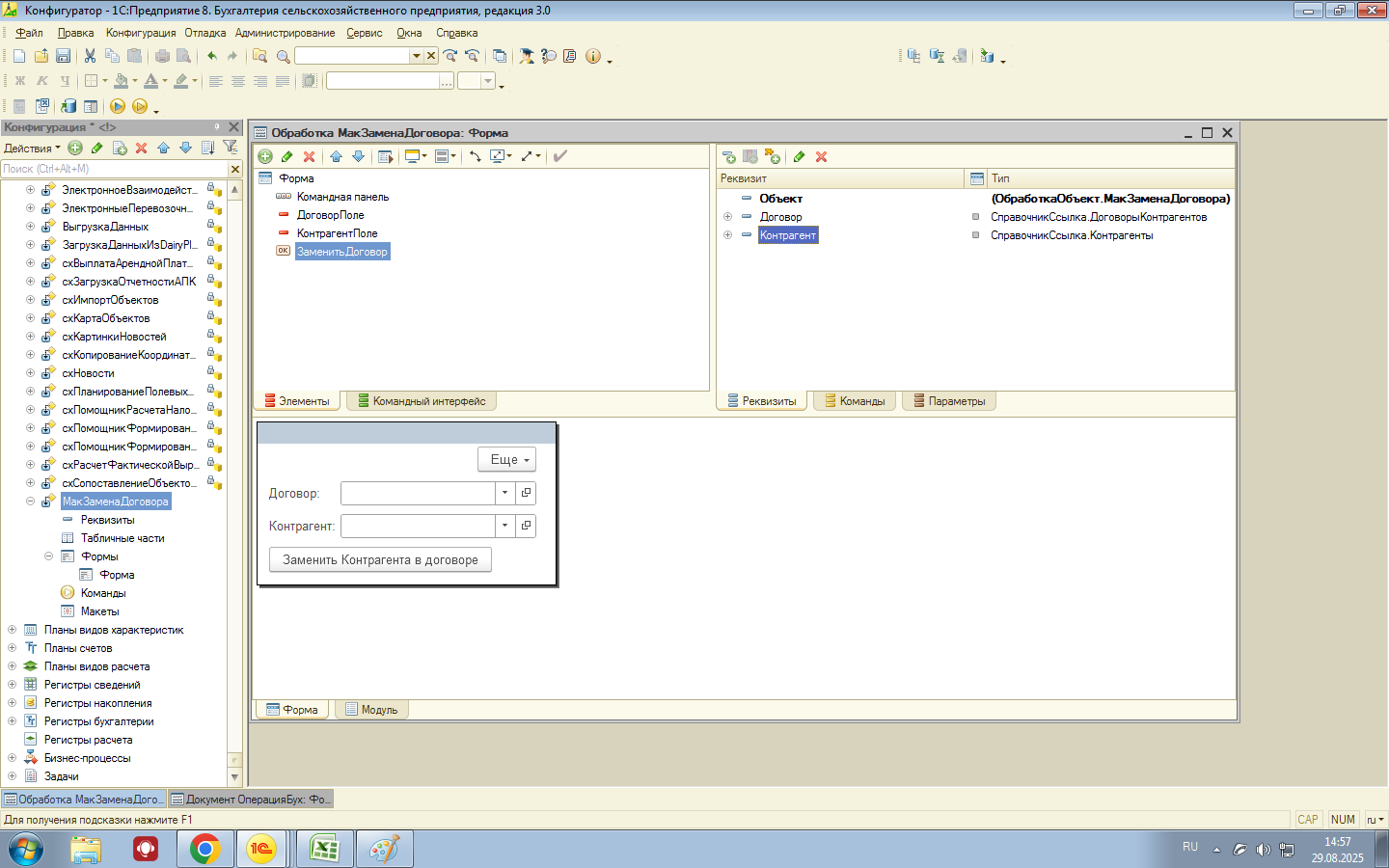 Анон, подскажи, почему не работает этот код и как правильно? Хочу внешней обработкой заменить в выбранном на форме договоре контрагента на выбранного на форме.