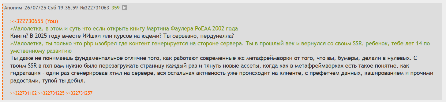 Алсо в дополнение к посту я просто прихуел с того обьеба знаний что нужно просто для формашлепства DDD ларавель и симфони это только базовый минимум, все хотять какойнить ебанный адовый пиздец прикрутить #хуйнянейм, а вот нам надо еще докрутить хуйню на эту хуйню с выходом в другую хуйню и чтобы через телеграм бота работало, а еще надо вот это и вот это и вот я с ебалом лягушки умею только интернет магазины шлепать великая нейросеть спаси короче пиздец но местами прям интересно как это чудовище вообще деплоится, и опять же умение спрашивать и внятно формулировать суть проблеммы чертовски важная хуйня.