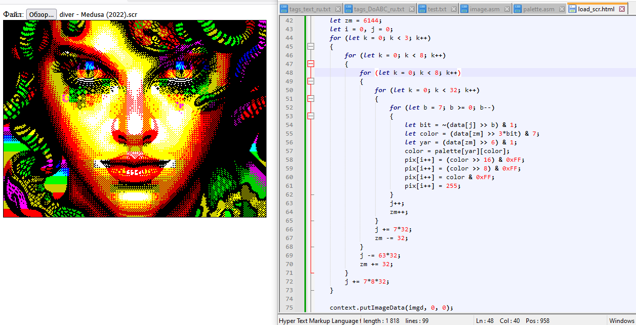 >>3560218 Да. Жесть. Я сейчас попробовал ради спортивного интереса в дампе спектрумовской видеопамяти разобраться и вывести картинку на экран и офигел пока делал это.