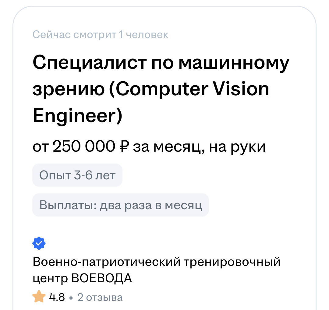 >>3580369 >Но какие-то зарплаты синек рисуют грустные - те же 350к. >Или вон - синька CV для военки от 250к. Охуеть вообще >Неужто люди, обучающие нейронки водить машины или собирать урожай без участия человека, получают край 350к