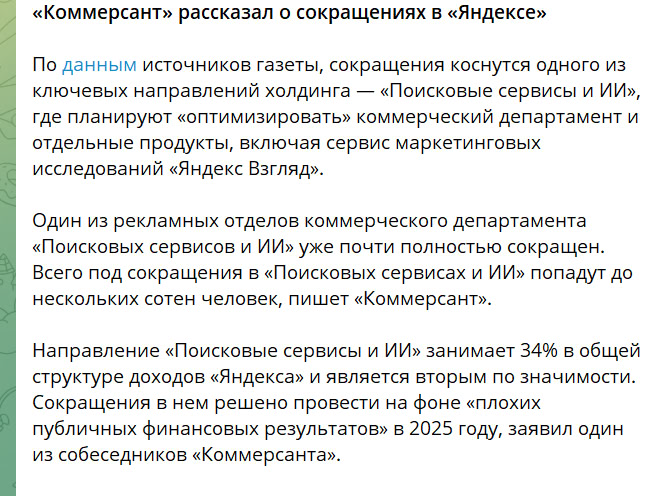 По данным (https://www.kommersant.ru/doc/8512591) источников газеты, сокращения коснутся одного из ключевых направлений холдинга — «Поисковые сервисы и ИИ», где планируют «оптимизировать» коммерческий департамент и отдельные продукты, включая сервис маркетинговых исследований «Яндекс Взгляд».