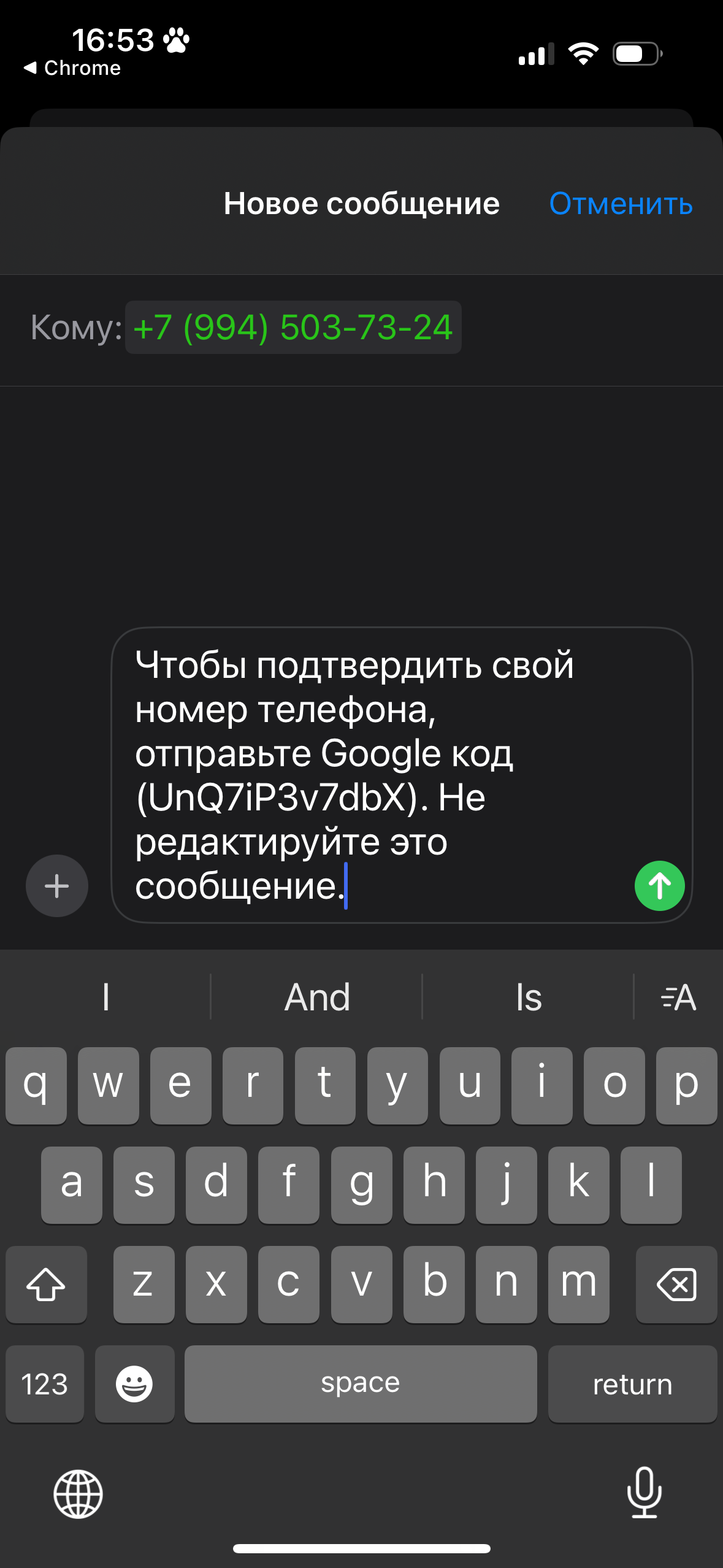 Далее регистрация: Прохожу все этапы и появляется QR код (пирил2) ,при открытии QR кода через мобильный браузер в режиме инкогнито+VPN, открывается страница гугл и предлагает открыть приложение СООБЩЕНИЯ (на iOS), когда открываю прил. СООБЩЕНИЯ уже там появляется российский номер гугла, на который нужно отправить сообщение (пик4).
