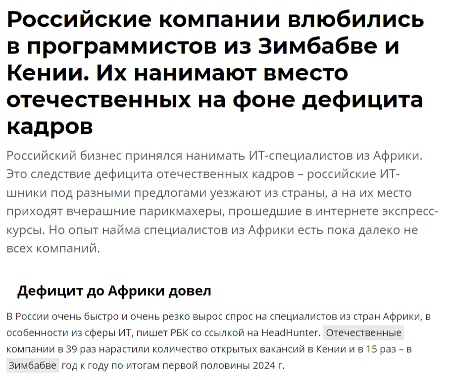 >выпускников нормальных вузов Вы дети дауны или что? Сытые годы закончились. Экономика в пизде, санкции, интернет анально огорожен, ставка ебанутая, предпринимательство или бизнес проекты и без этого были рисковым делом, теперь так вообще. Всё что сейчас происходит это оптимизация и сокращение издержек. Нанимать будут даже африканцев за бутылку чистой воды, лишь бы не Ваню с его 300к\наносек.