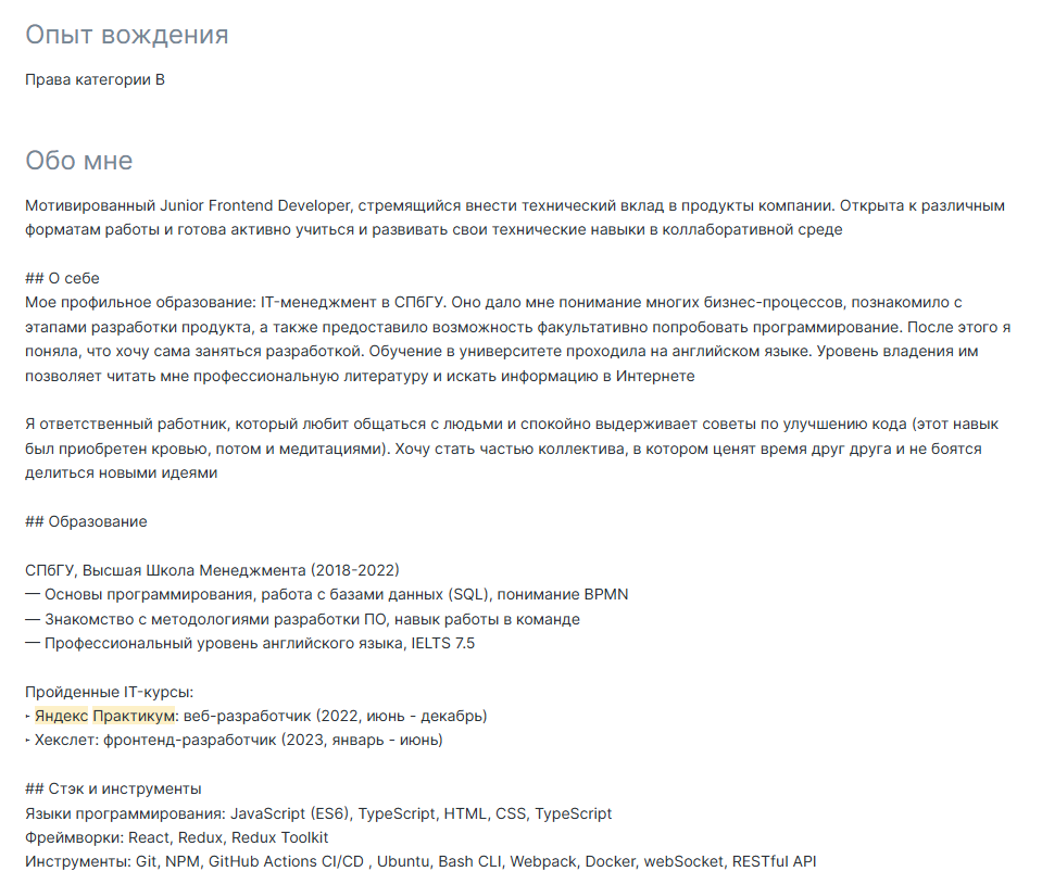 >>3360399 Ну ты явно не понимаешь, как работает практикум, там буквально заставляют заполнять так резюме. Его еще и должен утвердить местный ревьюер-эйчар.