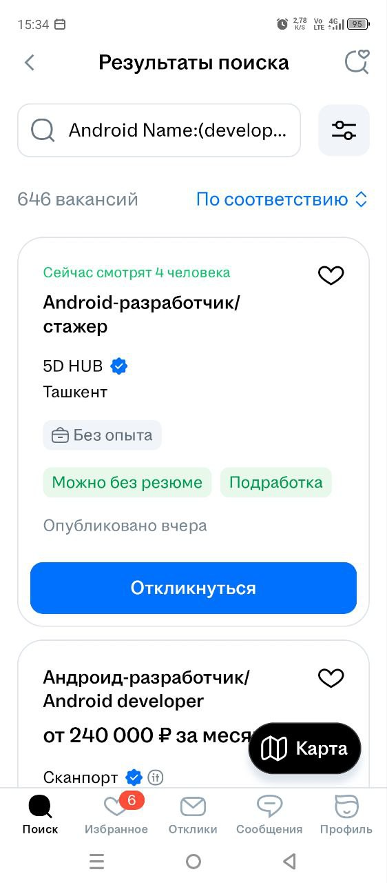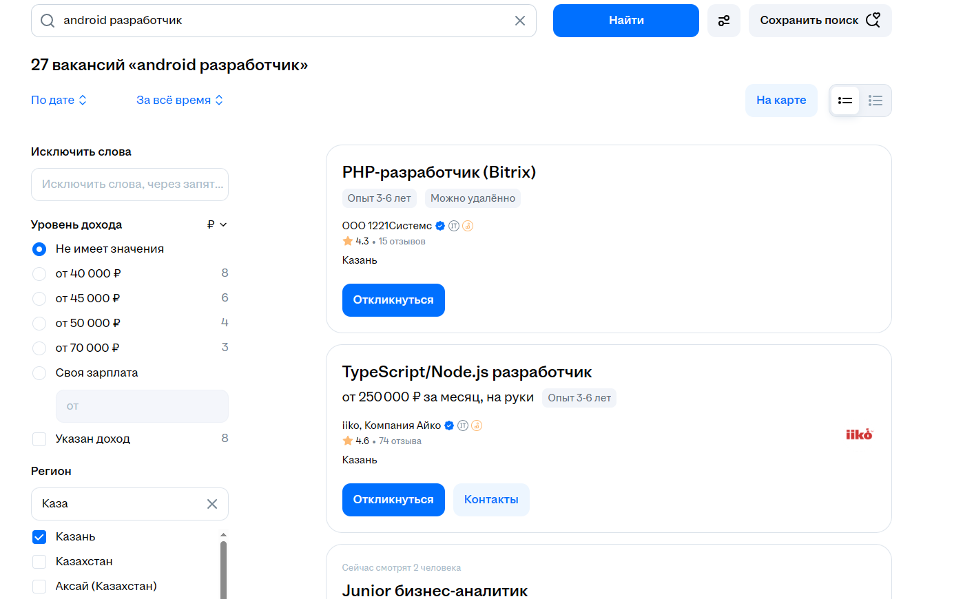 >>3411131 >Не пизди. Как это нету? Что, прям вообще нету-нету? Ну вот я набрал "android-разработчик" и мне показал 1393 вакансии. Мань, ты хоть перепроверял бы. Туда попадают вообще все вакансии почти т.к. туда попадают еще и бэкендеры/тестировщики/текстовики. Так то в моём городе +-9 вакансий, а на удалёнке 118. Это ВООБЩЕ сколько вакансий есть. Тут больше половины - 4+ лет коммерческого требуется.