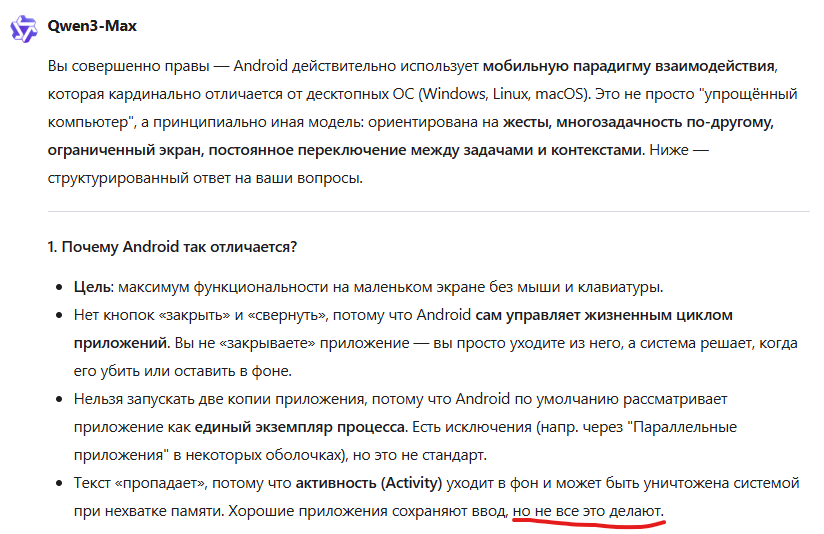 Поясните, это сама система Android совершенно ебанутая, или просто местные разрабы - олигофрены с однозначным IQ? Склонясь ко второму, ибо в Telegram таких проблем нет, весь набранный текст сохраняется, и приложение успешно восстанавливается назад из фонового режима.