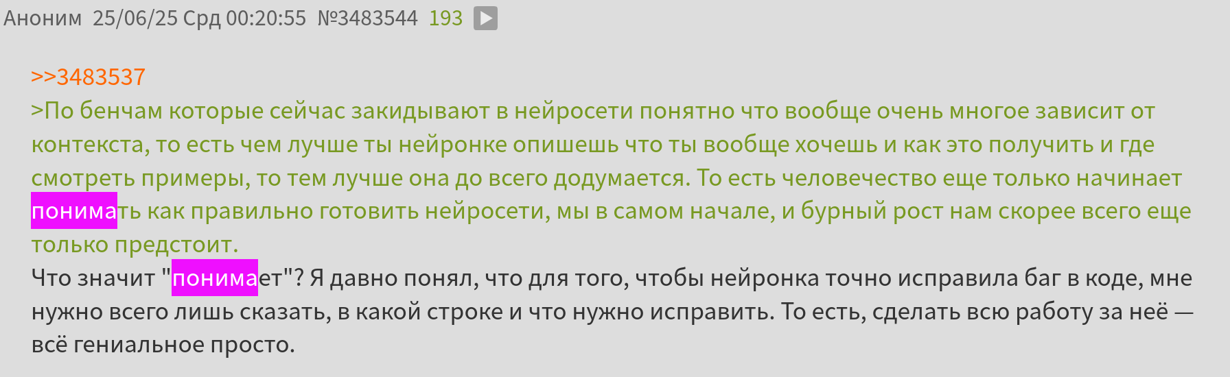 А нейросеть действует сама, сама думает и отвечает, причем по факту делает это лучше человека. И данный 2ch тому бесспорное доказательство. Я годами тут сижу и вменяемые ответы вижу 1-2 раза в год, а всё остальное время тупое кукареканье куда хуже нейросети.