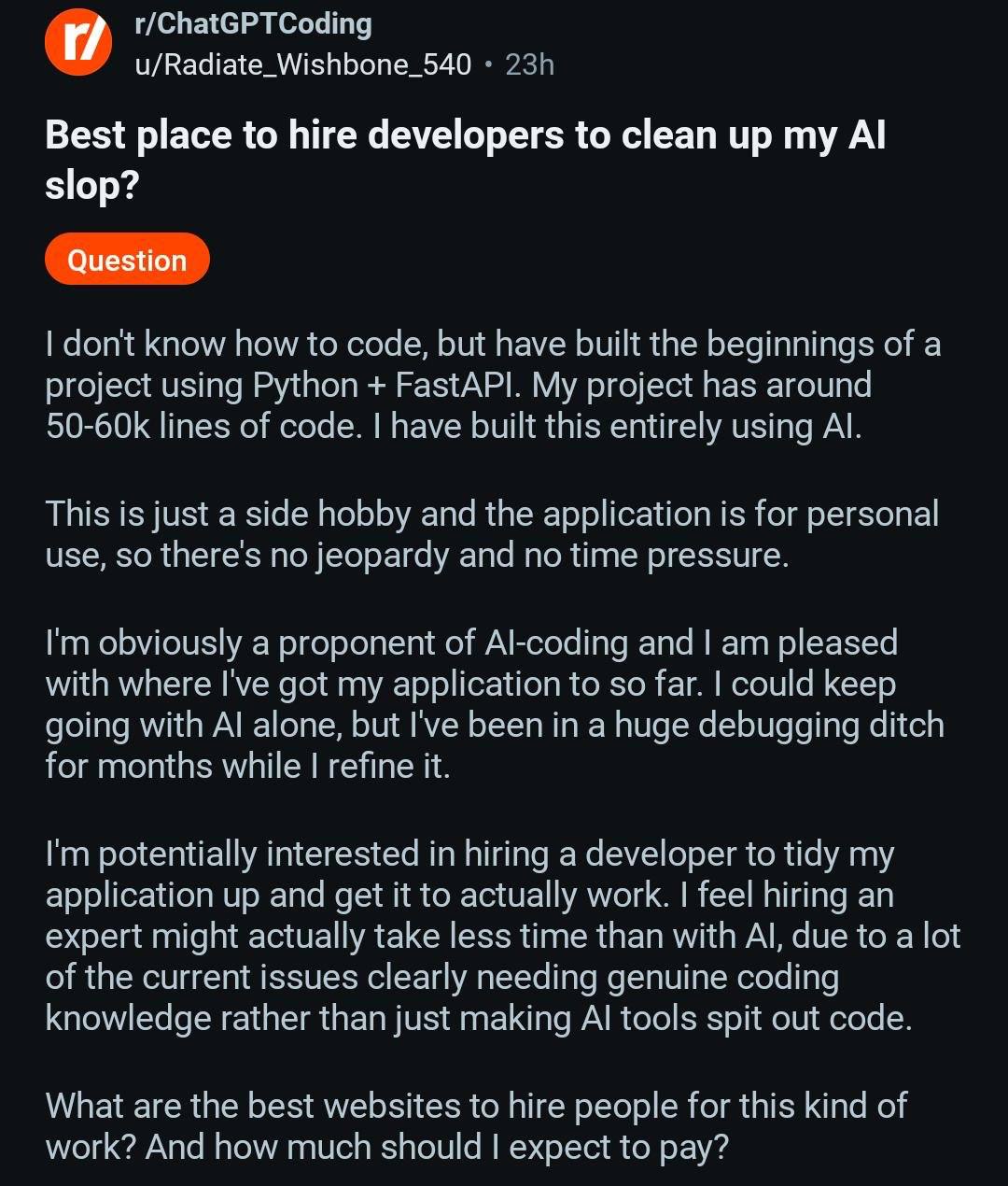 Смотрю на реддите в соотв. разделе что там люди с жптишкой создают, и мне кажется итс овер. Буквально михалычи 40 лет с опытом работы в пятерочке кодируют себе работающую аппликуху чисто на промтах. И это блин работает. С первого раза? Нет. Без багов? Нет. Понимает ли михалыч, что его программа делает? Нет. Претендует ли михалыч на место кодера? Нет! Нахуя теперь нужны кодеры и кодерские галеры, если михалыч с образованием 7 классов может надиктовать голосовухой ИИшке че делать, и через несколько итераций получить готовую фичу. Итс овер гайс, итс овер. Я фильтровал некоторое время заебавший хайп по ИИшке, но это игнорировать уже просто невозможно.