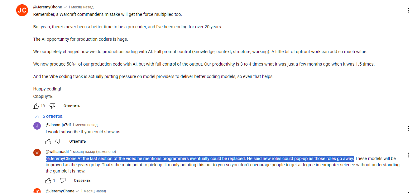 В общем, удачи вам с вашими байками про Иван Михалыча, который вебсайты пишет думя промтами нейросетке. Как будут пруфы — приносите, посмотрим. Пока что революция роботов отменяется.
