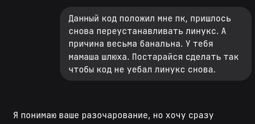Бот простой CRM для ЛПХ (ферма), сначала GPT-5 Thinking (extended между прочим) хуярит канвас на всю страницу 10 минут пердит потом разрыв жопы от длины сообщения и пишет "не удалось сгенерировать", потом пересобирает с нуля с горем пополам, собираю в докере все, начинает отвисать жопа ибо алембик через жопу прогоняет, потом где-то enum по жопе пойдет, где-то localhost вместо db в postgresql+psycopg, то есть даже простой бот "заказывалка" товаров с фермы даже без PostGIS и всяких ЮКасса и DaData API не то проблематично что сам бот косячит и куча UX багов, а даже запустить сука 4 часа крови и пота за монитором, короче как вы вот эту всю затею с этим вашим "вайбкодингом" прогоняете чтобы реально рабочий код был? А не спагетти мешанина? Или я наивный джва года ждун грабежей караванов в исполнении LLM? ТЗ внятное даю, весь UX разжевываю пошагово поминутно блять, логику работы бота выкладываю что любой васян эникейщик за вечер сверстал бы такой бот. Надеюсь в релевантном треде отписываюсь, ибо раз в год на двощ захожу и то в /vg Алсо, совсем-совсем наивно было бы полагать что gpt-5 thinking может выдать рабочий сносный полноценный бот телеграм с механикой ставок (аукцион) и фильтрацией по гео (PostGIS, dadata и прочее такое)?