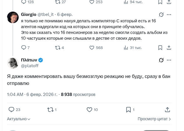 Вот при всём том, что сам Антропик говорит, что код говно, сделан не опримально, задача решена не полностью (нет линкера, например), и да, учебников масса, разборов масса, компиляторов довольно много, но всё равно, результат хороший довольно.