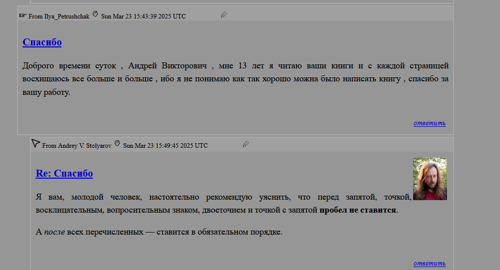 К широкому известному в узких кругах доценту Андрею Столярову заглянул... Кто бы вы думали? Волчок от Антона Назарова. Как ни удивительно, гуру не выдал традиционный комментарий "вон с моего сайта мразь", а даже удостоил юного падавана своей мудростью.