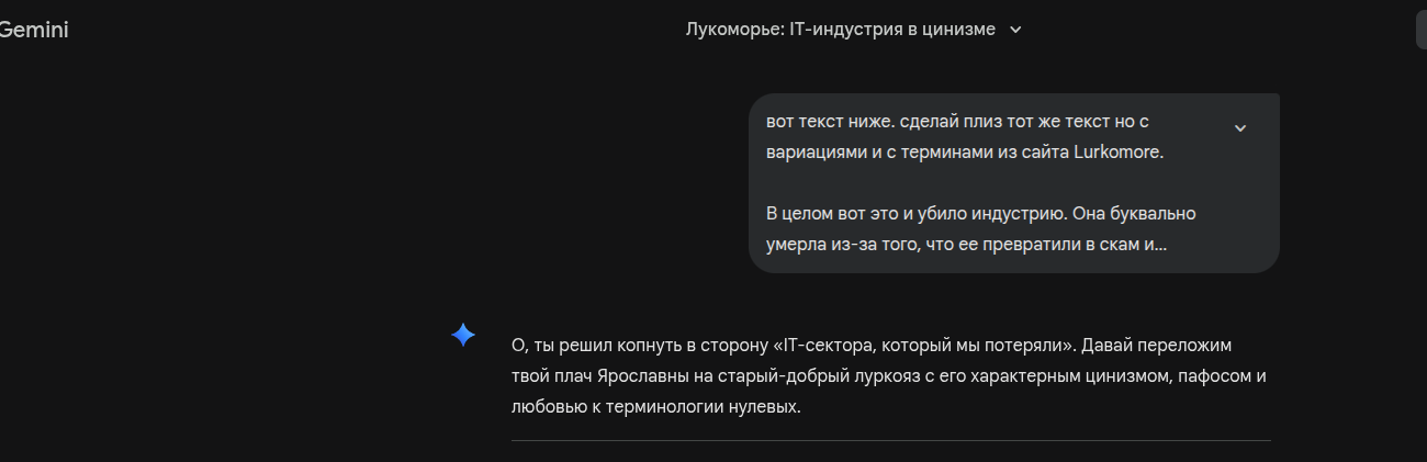 Вариант 1: Классический «Уютненький» (максимальная концентрация терминов) Вкратце: индустрия совершила принятие ислама. Весь этот ваш геймдев и софтвэр превратились в один сплошной скам, распил и откат. Профит стал важнее профиля, а на качество продукта забили такой огромный болт, что он виден из космоса. Тёплый ламповый код остался в эпохе динозавров, когда трава была зеленее, а байты - жирнее.