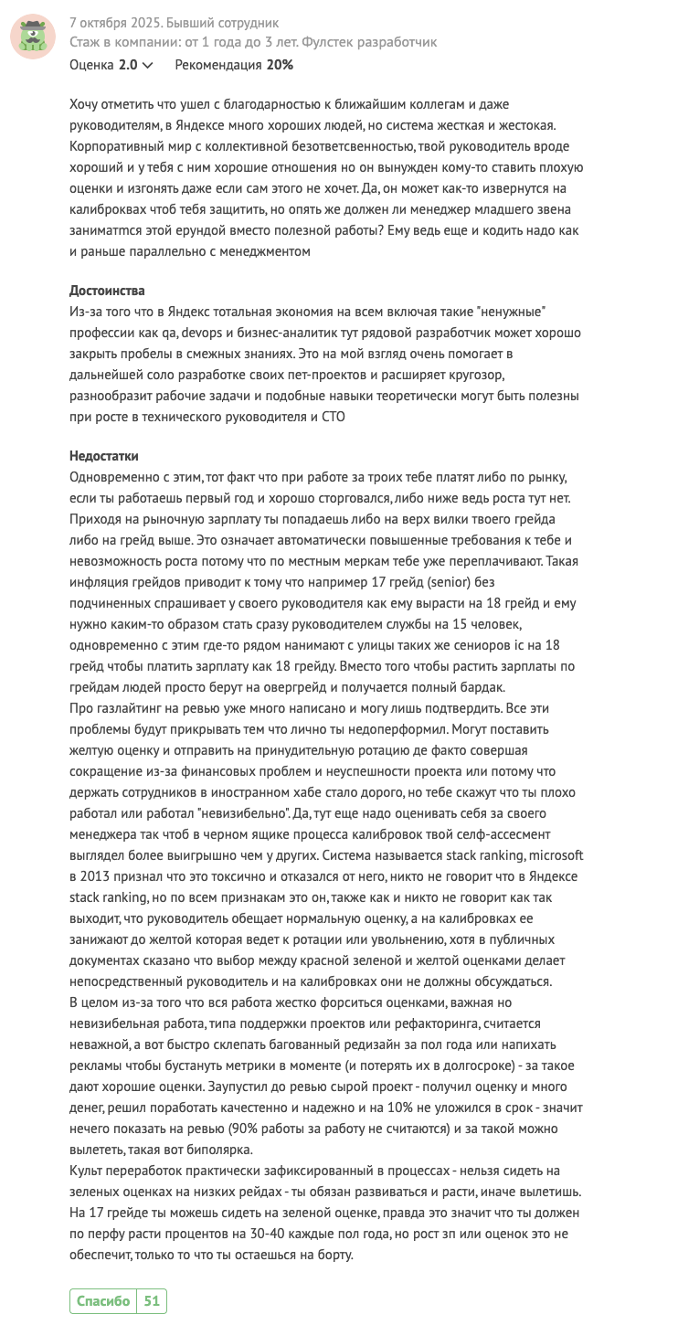 Опять же - я в яшке работал, меня из яшки выгнали после ревью, я написал негативный отзыв и прочитал все другие отзывы. И большая часть отзывов очень точно описывают происходящее в компании.