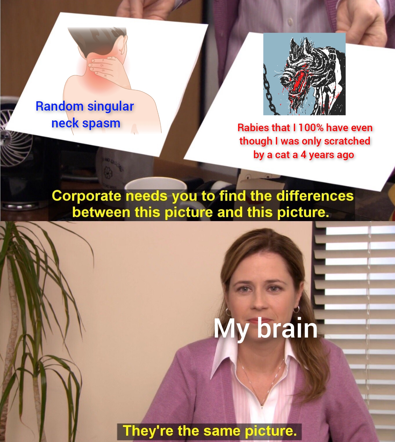 Сап, двач. Уже несколько лет меня преследует страх бешенства. Как я выяснил из реддита, это довольно распространенное явление, оно же Rabies OCD (ОКР по бешенству). Я не ставлю себе диагноз ОКР, просто делюсь и спрашиваю совета у анона. Началось все с травмирующего опыта - меня оцарапал уличный кот. Но страх пришел лишь через год после инцидента, когда я случайно заинтересовался этой темой и впервые зашёл на сайт ВОЗ'а. Там была это пугающая надпись: "инкубационный период до года". Я не спал, не ел, даже не дрочил несколько дней. Я был на нервах, мысли о том, что бешенство вот-вот проявится не давали мне покоя. Я стал крайне нервным - постоянно оглядывался (ведь за мной могло идти бешеное животное), боялся выходить на улицу и, если видел какое-то бродячее животное, буквально не спускал с него глаз, даже не моргал (я боялся того, что это животное может быстро-быстро меня укусить, а я и не замечу). Дальше на пару месяцев все прошло. Но потом началось снова, и продолжается до сих пор. Мне страшно выходить на улицу, я постоянно проверяю "а закрыты ли окна?", ибо в них могут залететь летучие мыши, я не отхожу далеко от дома, ведь из леса может придти бешеная лиса. Приходя домой, я осматриваю ноги и руки на предмет микротравм, и даже укус комара или отсутствие повреждений вызывает у меня панику (в случае с комаром я думаю, что это может быть диковинный укус. В случае с отсутствием микротравм я думаю, что это, может, от того, что я недостаточно хорошо осмотрел свои ноги/руки). Иногда бывает тяжело заснуть от страха, что меня укусят во сне. Каждое животное и растение, даже птиц, пауков и кусты я воспринимаю как потенциальный источник заражения и стараюсь их обходить за километр. Любое недомогание или единичные болевые эпизоды я воспринимаю, как начало конца (что в юмористической форме показано на пике 2, хотя я думаю о конце даже если меня никакой кот не кусал и курсы прививок я всё ещё прохожу). Дошло все до того, что я начал обманывать врачей, говоря, что мне укусили, хотя меня не кусали (врачи не обманывались, ибо курс был начат а, значит, защита ещё есть, хотя я им малость не верю). Через пару дней последняя прививка, к слову. По этому вопросу (фоби́и бешенства, как произносил это один диктор) я записался к клиническому психологу (в бесплатной поликлинике, ибо на платных денег нет, да и в глубинке, в которой я проживаю, такого специалиста днём с огнём не сыщешь). Та мне сказала, цитирую, "обращаться к объективному" ("если следов укусов нет и боли нет - значит, волноваться нечего"), "вести дневник" (сделал пару записей и забыл о нем), "переубеждать себя" (я пытался ей объяснить, что это не работает, но она не слушала). Между прочем, забавно, что я все эти советы (кроме дневника) уже слышал от матери.