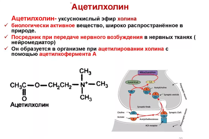 Ацетилхолин — это важнейший нейромедиатор, передающий сигналы между нервными и мышечными клетками, а также в различных отделах мозга и вегетативной нервной системы, отвечающий за память, внимание, сон и мышечные сокращения, который быстро разрушается ферментом ацетилхолинэстеразой, и его дисбаланс связан с заболеваниями (например, Альцгеймера) и действием лекарств . Принцип работы