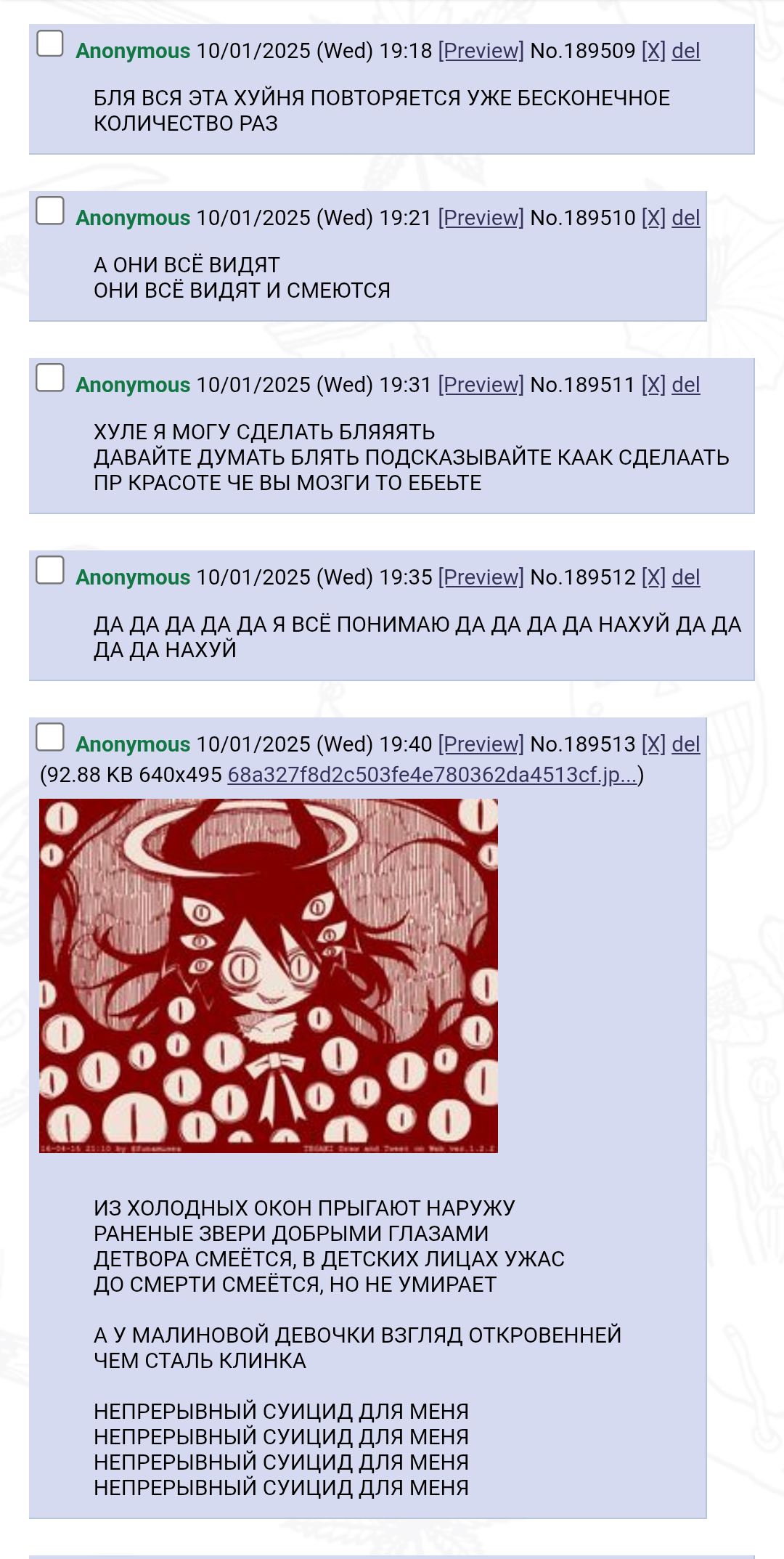 Ребят лечите свои беды с башкой пока еще не поздно, а то будете как это чудище, он 24/7 (реально блять 24/7) сам с собой переписывается на одной мертвой борде, это буквально карикатурный псих. Как бы хуево конечно что всё так, но он сам виноват, жрал наркоту, нихера не лечился, не будьте такими.