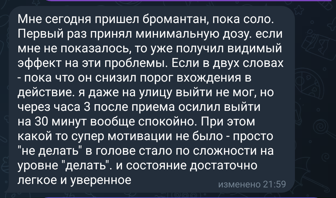 Итого Что мне пить, и как достать чтобы: 1. Стало легче работать, были силы на работу, была усидчивость стабильная 2. Возможно хотелось бы избавить себя от дпдр эмоциональной пелены, но не знаю надо ли оно мне
