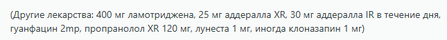 Из нейролептиков пью квет на ночь, есть рисперидон, совсем ебанутые нервозы/психозы/мании хз как это назвать снимаю им изредка. Латуду пил, эффекта особо не почуствовал. Нейронка советует арипипразол, но у меня щас нет денег на него и чет сомневаюсь, что поможет.