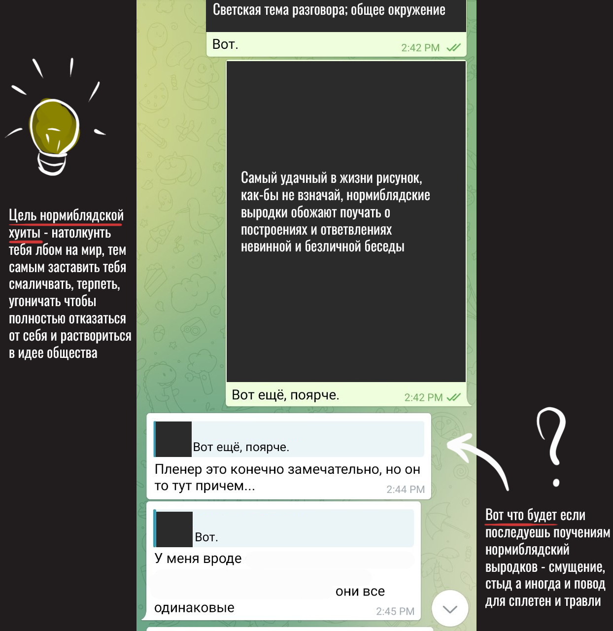 > Во всяком случае если мне будут писать в чате и я буду получать от этого удовольствие Ага хуй там чаты сейчас это рак, их модерируют ебанутые, менч в последнем где я проявлял долю актива забанили за ...карикатуру негра. Чат российский. Эти люди промыты, их не спасти. К тому же у админов есть подсосы. И если ты напишешь что хоть кому-то из них не нравятся - тебя уничтожат. Личка воспылает, а на телефон закажут бомбер. Ты можешь написать "господин Шамиль, у вас не получилась тень левого рукава" - и всё. Будут потом ещё обсуждать за спиной, постить и смаковать как гиены, сделают стикер с твоим лицом, распечатают объявления "разыскивается живодёр", создадут таковой канал и выложат номер.