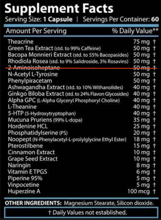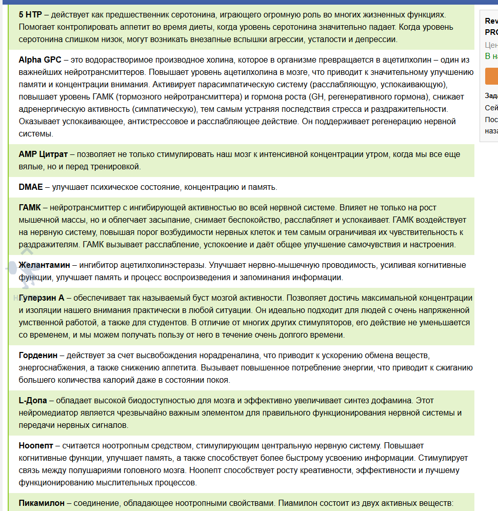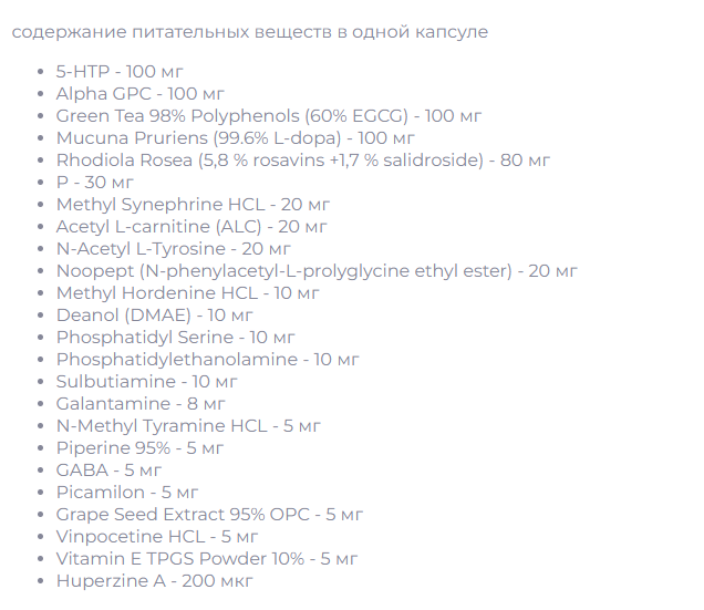 Теакрин - родственник кофеина, работает похоже, но заметно дольше Кофеин - все его знают, все его любят Бакопа - ноотроп, вроде, помогает с памятью 2-аминоизогептан (DMHA) - уже написал, полузапрещённый стимулятор, доза вроде средняя Ацетилтирозин - хитрый прекурсор дофамина, может какой-то позитивный эффект давать, но леводопа мощнее (и тошнотнее) Фенилпирацетам - всем известный фенотропил, несколько стимящий ноотроп, можно так купить Ашваганда - любопытная травка со свойствами, которые надо изучать. Кстати, её пока не осписочили, но объявили нежелательной, сложнее так найти стало Гинкго Билоба - травка со вроде бы ноотропными и успокаивающими свойствами, вряд ли сильная Альфа ГПЦ - писал L-теанин - успокаивающая аминокислота, компонент чая. Рекомендуют пить с кофеином чтобы стимулировало, но не трясло. Про недодоз писал. 5-HTP - писал Мукуна - про леводопу писал Горденин - писал Фосфатидилсерин - вещество вроде бы с ноотропным эффектом Ноопепт - писал Птеростилбен - брат ресвератрола, вроде какая-то польза здоровью есть, но вряд ли сильный Экстракт корицы - наверное вкусненько Экстракт винограда - наверное вкусненько Нарингин - только услышал, но польза здоровью вроде какая-то есть Витамин Е - полезно, но скорее при недостатке Пиперин - вещество из перца. Вроде помогает некоторым другим веществам в составе усваиваться Винпоцетин - какое-то известное лекарство для кровообращения. Вряд ли сильное. Гиперзин - писал