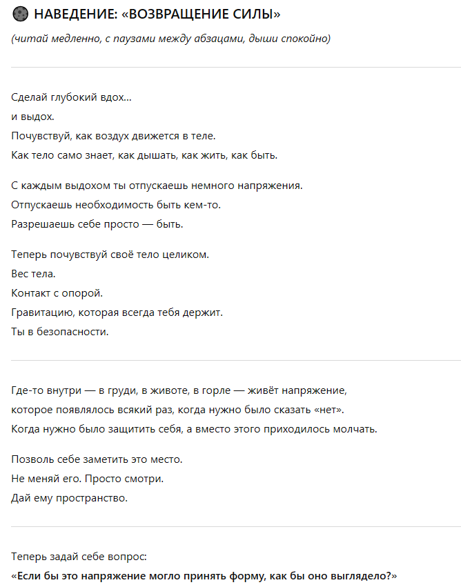 >>1893832 Анон, ну это навык, его нужно тренить. И конечно нужно начинать издалека. Ну типо хотя бы по 5-10 минут, раз в день, держать фокус на своих ощущениях просто так, в супер безопасной атмосфере. А не сразу лезть в дебаты с нарциссом психопатом, который людей блять доводит до РКН на спор по приколу. А суть базовые темы, во время ходьбы ощущать прикосновение стопы к земле. Потом дыхание, на 4 секунды вход, 6 выдох. Ну и дальше там всё тело сканируешь так. И особенно важно, что не нужно мысли подавлять, избегать, отвекаться от них. Нужно именно фокусироваться на себе. Т.е. это прям такое простое действие которое и определяет суть исцеления - фокус на себе. И там дальше начинается магия. Ну как вот например в какой-то компании разрешить себе оставаться собой, в соответствии со своими ощущениями, вместо того чтобы сходу подхватывать настроение в компании, тем самым растворяясь и теряя себя в этом. Недавно у меня случился довольно сложный разговор с достаточно тяжелым человеком, спорили с ним. Спор я не вывез, задавили аргументами, но сука, как же охуенно было что я не слился, не замычал, не схавал как обычно уйдя в подавленность. Удалось после разговора почти сразу прийти в себя, успокоиться и влиться обратно в свою рутину.