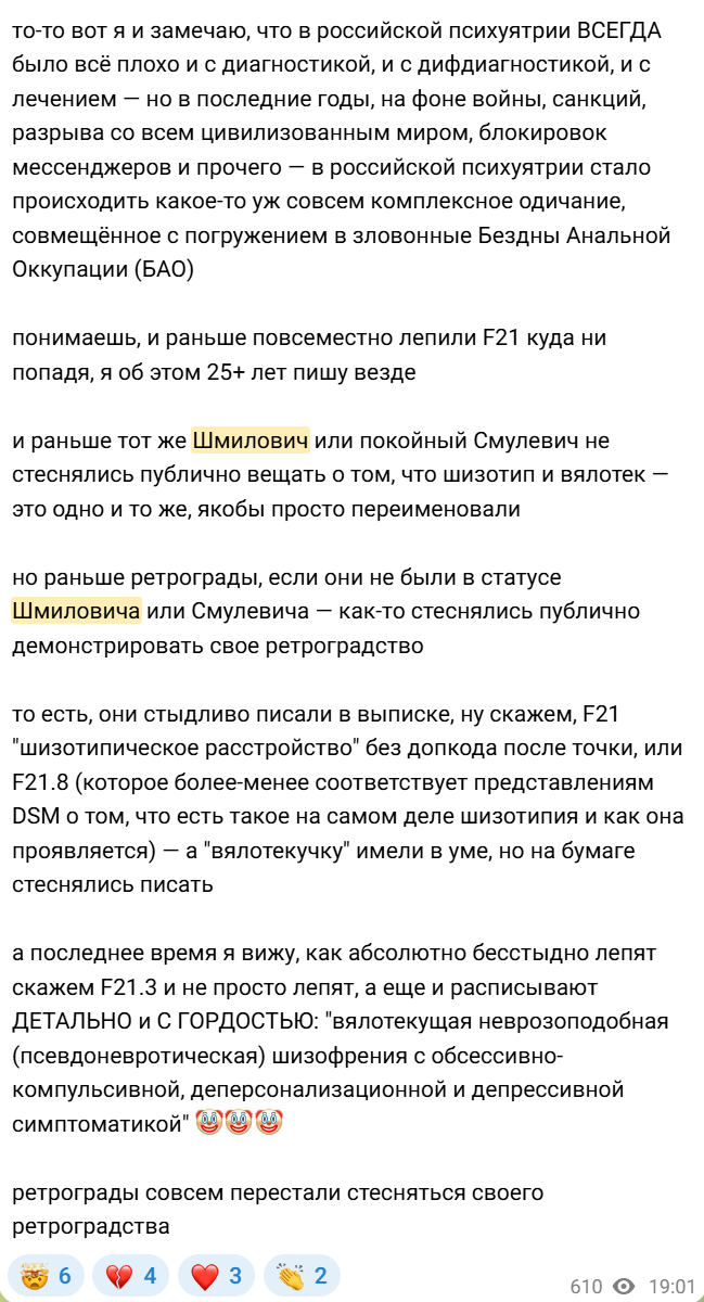 >>1887483 >МКБ-11 никаких шизоидов уже нет. МКБ ЭТО ПРОДАЖНАЯ ДЕВКА ПОСТМОДЕРНИЗМА, ДАЖЕ ТУДА ПРОНИКАЮТ СИМУЛЯКРЫ ВМЕСТО РЕАЛЬНЫХ ДИАГНОЗОВ. СНАЧАЛА ЭТОТ РАК РАСПРОСТРАНИЛСЯ В ГУМАНИТАРНЫХ НАУКАХ, НО НАЧИНАЕТ ПРОЛЕЗАТЬ И В ЕСТЕСТВЕННЫЕ НАУКИ