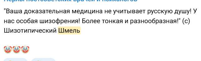 >>1906400 >вывод о невозможности отличить здоровых пациентов от больных в условиях психиатрических учреждений, Этот вывод сливается простым утверждением. Не существует здоровых людей, все в той или иной степени ебанутые. Так что те якобы симмулянты в реальности могут быть шизиками. В том числе и абсолютно все психуяторы и санитары тоже шизики, поэтому когда их предупредили что будут симмулянты им начало глючиться что пациенты все симмулянты. Так что тут только присягнуть ШУЕ ППШ остаётся.