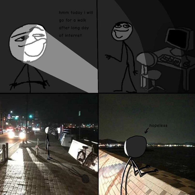 Одно время на двоще форсили мемасик, вроде "братишка" его называли - там некое страшное существо пыталось втереться в доверие и говорило типа "я такой же как ты, люблю делать всякие человеческие вещи, например пить воду". Он запал мне в душу. Кажется, что я похож на эту тварь, когда пытаюсь общаться с нормисами. Как будто что у меня нет ничего общего с этими человеческими существами и неочем говорить. Люблю пить воду, хуле.
