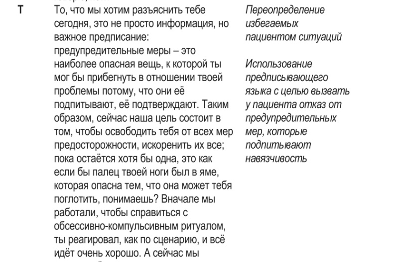 «Навязчивость остаётся в голове? Отлично, носи её с собой как будто это саундтрек к фильму, но избегай поведенческих реакций, которые дадут тебе успокоение. Это основная цель, если мы её добьёмся, то вслед за этим разрушим и всё остальное.»