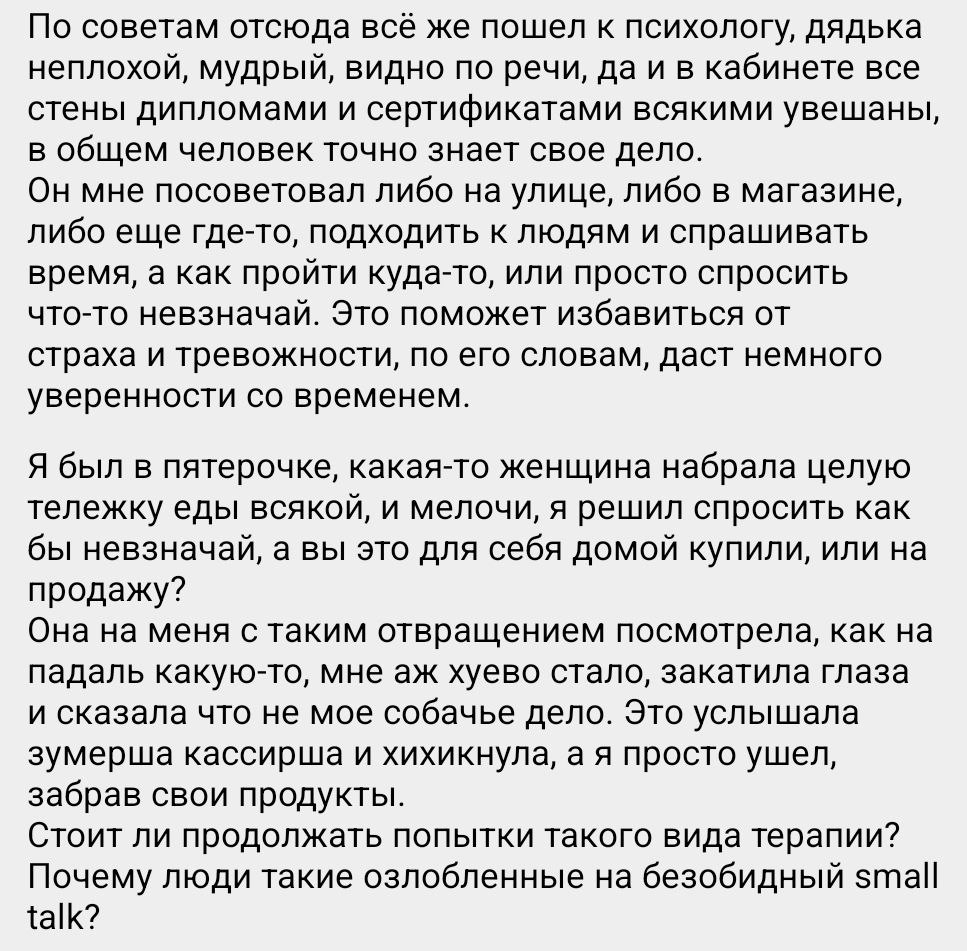 Вот. Понимаю, что типикал социофобное мышление, но раскладывая на атомы эти мысли, меняя убеждения, разумеется опытным путем, подобные мысли не отпускают. В итоге кптшник сдался и предложил пойти попробовать с психоаналитиком пообщаться или с гештальтистом. Как мне это поможет?