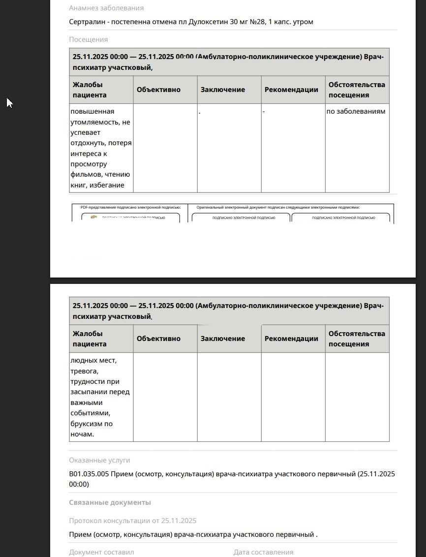 К тому же, мои таблетосы (дулоксетин, миртазапин, спитомин) заменили на эсциталопрам и тритико и выдали их там.