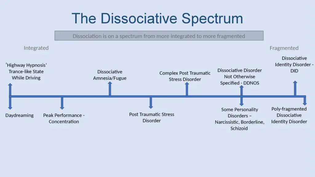 Тема ДРИ на самом деле глубокая, коморбидная, то есть связана ещё и с травмой, как правило комплексной. Мы имеем дело с КПТСР и диссоциативными проявлениями (дереализация деперсонализация). В зависимости от того, какая была травма и как долго субъект находился под влиянием травматичных событий, будет степень диссоциированности.