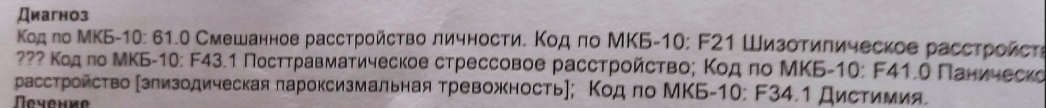 У меня несколько иная ситуация. Стоит аутизм-->ф20.0 и диссоциативная амнезия (спасибо нашей гипердиагностике за автошизу). Но хоть инвалидность есть. Хотел сказать, что потратил примерно 2 года чтобы понять что же реально со мной не так, делал попытки обращаться к частнникам, которые все были дропнуты после 1-2 приёмов так как появилось сомнение в их квалификации и было неприятно с ними работать. Сам начал копаться пытаться по осколочкам
