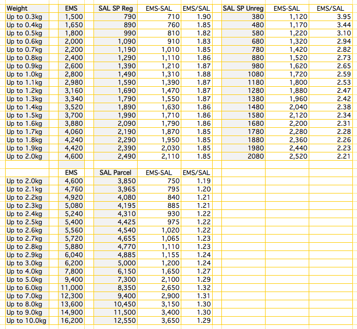 >>20669 Я обычно ориентируюсь, что одна фигурка весит меньше килограмма и влазит в категорию мелкий пакет, а не посылка. Тогда в мои ебеня стоимость доставки салом 2к йен, емс — 3,5к йен.