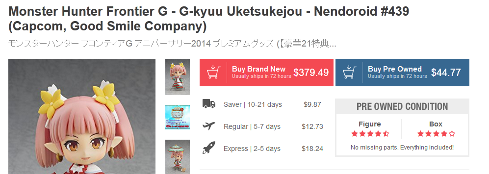 >>25866 Нендороид не такая уж редкость. Смотри, он есть в Суругайе прямо сейчас. http://www.suruga-ya.jp/product/detail/602056096001 Его можно заказать, например, через zenmarket, это хороший прокси для покупок из Японии, комиссия фиксированная 300 йен. Я покупал через них в Суругайе 2 фигурки, все было хорошо. Кстати, доставка по японии в Суругайе бесплатная при покупке от 1500 йен, так что ты можешь купить эту Фейрис за 2200+300+доставка. Если интересно, я тебе кину линк на регистрацию в зенмаркет, там будет скидка 500 йен на первую покупку а мне дадут бонус за тебя, что-то около 1000 йен.