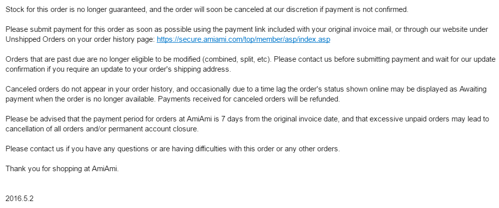 Есть кто живой? Я тут недавно объебался и не оплатил заказ с ами на что получил писмо от саппорта в лицо. Они пишут, что скоро мой заказ прикроют и я не смогу оплатить, но написали они это 2/05 за несколько часов до дэдлайна. Прошло уже три дня, а мой заказ всё ещё Awaiting Payment. Я немного запутался в их письме. Как они пишут, просроченные заказы нельзя модифицировать, то есть я могу их оплатить, но не изменять, а потом пишут, что из-за лага их сайта эти самые просроченные заказы уже не существуют, но всё ещё Awaiting Payment.
