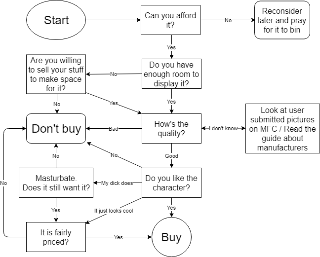 >>42485 >png >>42486 Бредовая схема. Можно следовать строго вниз (ну или через it just looks cool) в случае десятков разных фигурок, и таким образом слить деньги на ненужную хуету. В реальности процесс выбора должен завершаться вопросами "Нет ли лучшего применения этим деньгам?" и "Как сильно будет гореть моя жопа, если я это не куплю?".