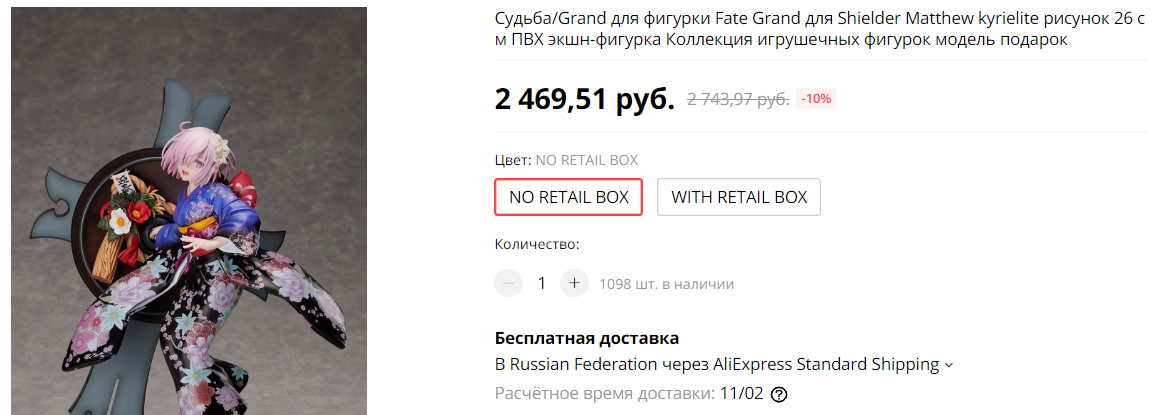 >>46841 1) Фотография от оригинальной фигурки. Тебе приедет (очевидно) не то, что показано на картинке. Насколько хуже - хз. Имхо, букет во внутренней части щита будет похерен в первую очередь. 2) Ты сыграешь в лотерею на доставке. "Без retail box" - она приедет, обмотанная в пупырку, так что молись, чтобы не сломалась по дороге. "С retail box" - она приедет, обмотанная в пупырку, а коробка будет сложенной валяться на дне посылки и никак не амортизировать содержимое. Короче, блистера не будет. Из-за того, что отстоящие части юкаты не отстегиваются, на твоем месте я бы сильно сцал, что в пупырке она не приедет целой. 3) Тебе может приехать сверток пупырки вообще без картонной коробки. Узнавай об этом у китайца, чтоли.